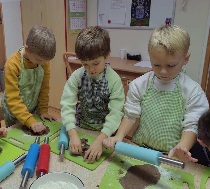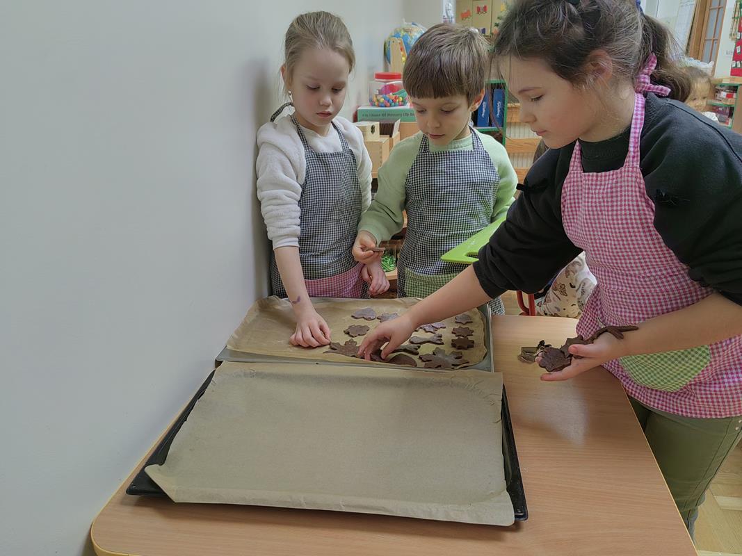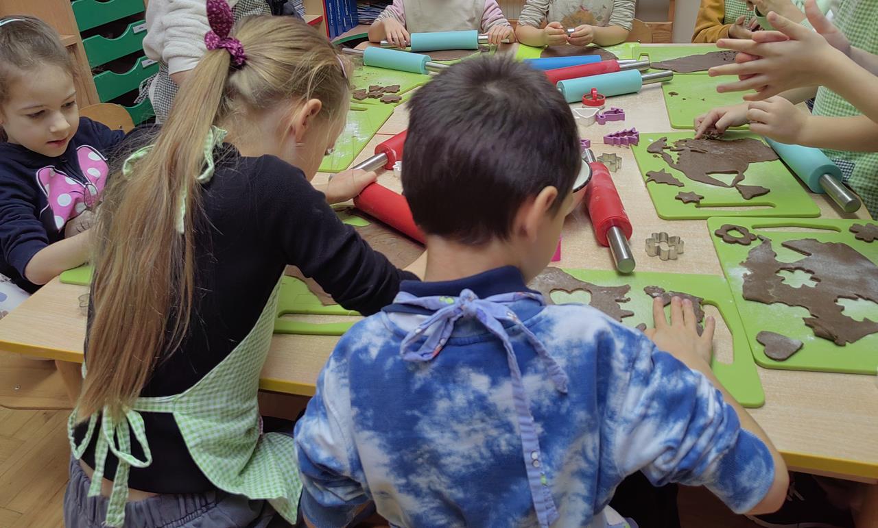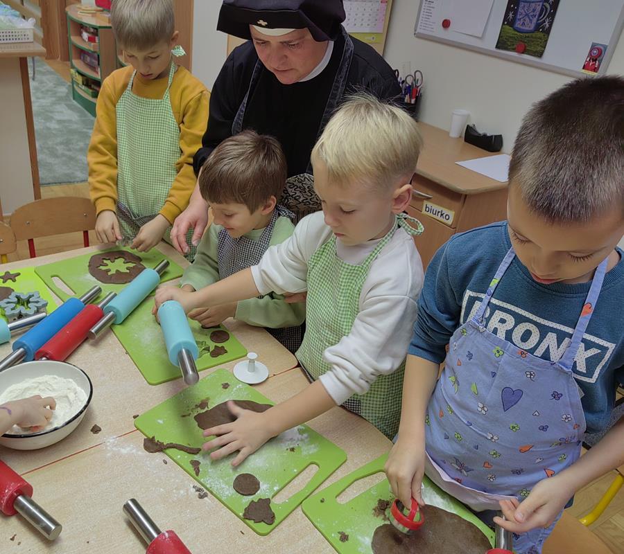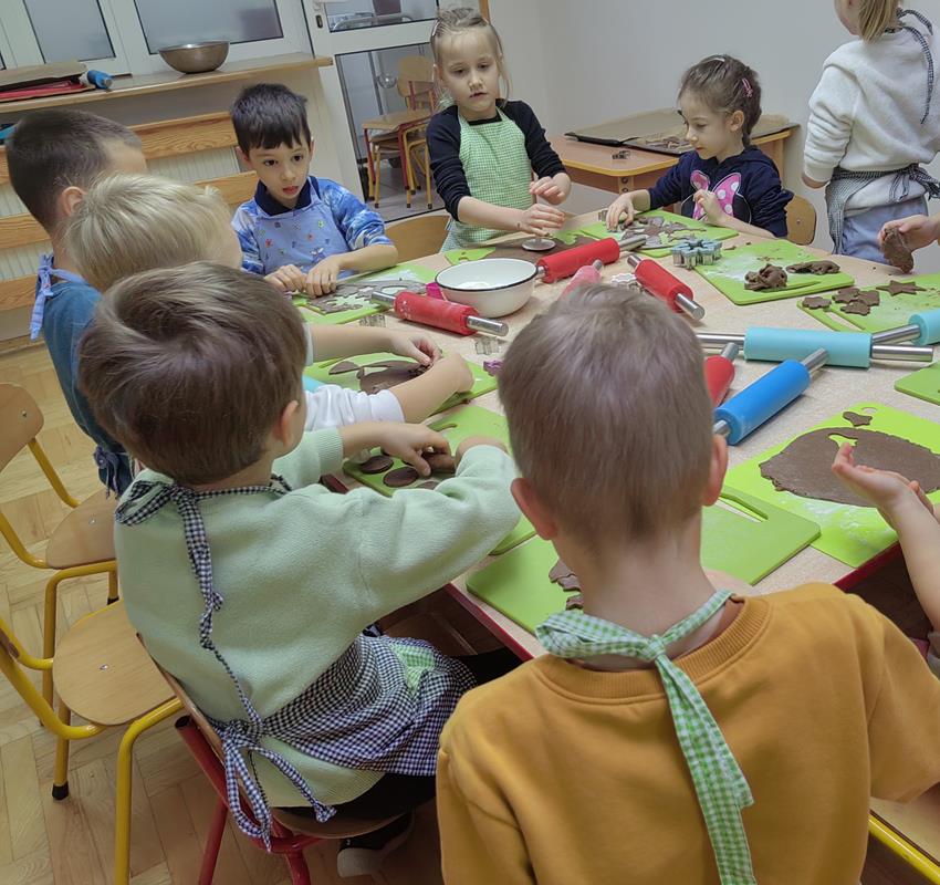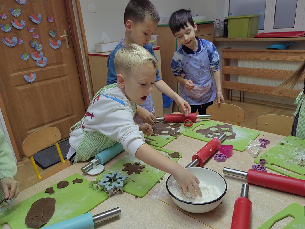 W dniach 11 grudnia 2025 roku sala 6-latków zamieniła się w cukiernię a przedszkolaki w profesjonalnych cukierników. Tego dnia niezwykle pracowite 6-latki podjęły zadanie przygotowania świątecznych pierników. Pierwszym etapem pracy było przypomnienie zasad higienicznych obowiązujących w trakcie zadań związanych z artykułami spożywczymi. Następnie rozpoczął się najbardziej emocjonujący etap wałkowania ciasta i wycinania pierniczków. Dzieci porównywały także konsystencje używanych produktów np. mąki i gotowego ciasta oraz obserwowały efekty ich długiego trzymania w ciepłych rękach. Zabawa z ciastem była też świetną okazją do lepienia kul a nawet bałwanka. Po wypieczeniu pierniczki czekały na dekoracyjne ubranka z lukru i kolorowych posypek. Wykazały się wytrwałością, siłą w wałkowaniu, spostrzegawczością oraz ogromną kreatywnością. Zatem oczekujcie z niecierpliwością piernikowych niespodzianek. My już spróbowaliśmy i pierniczki są smakowite…