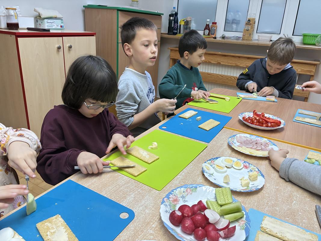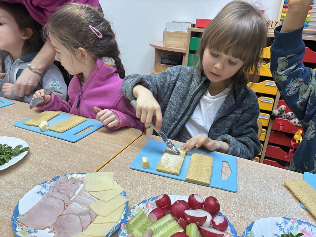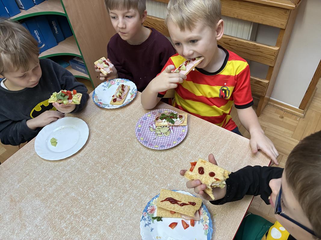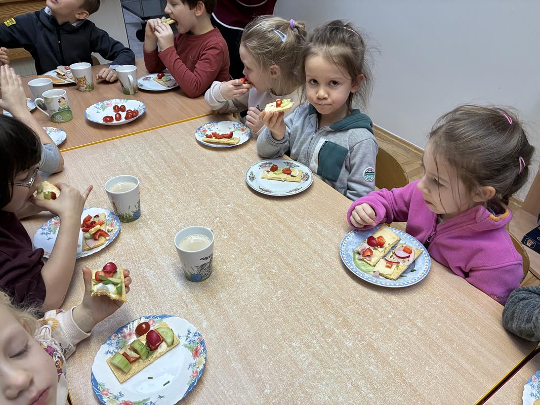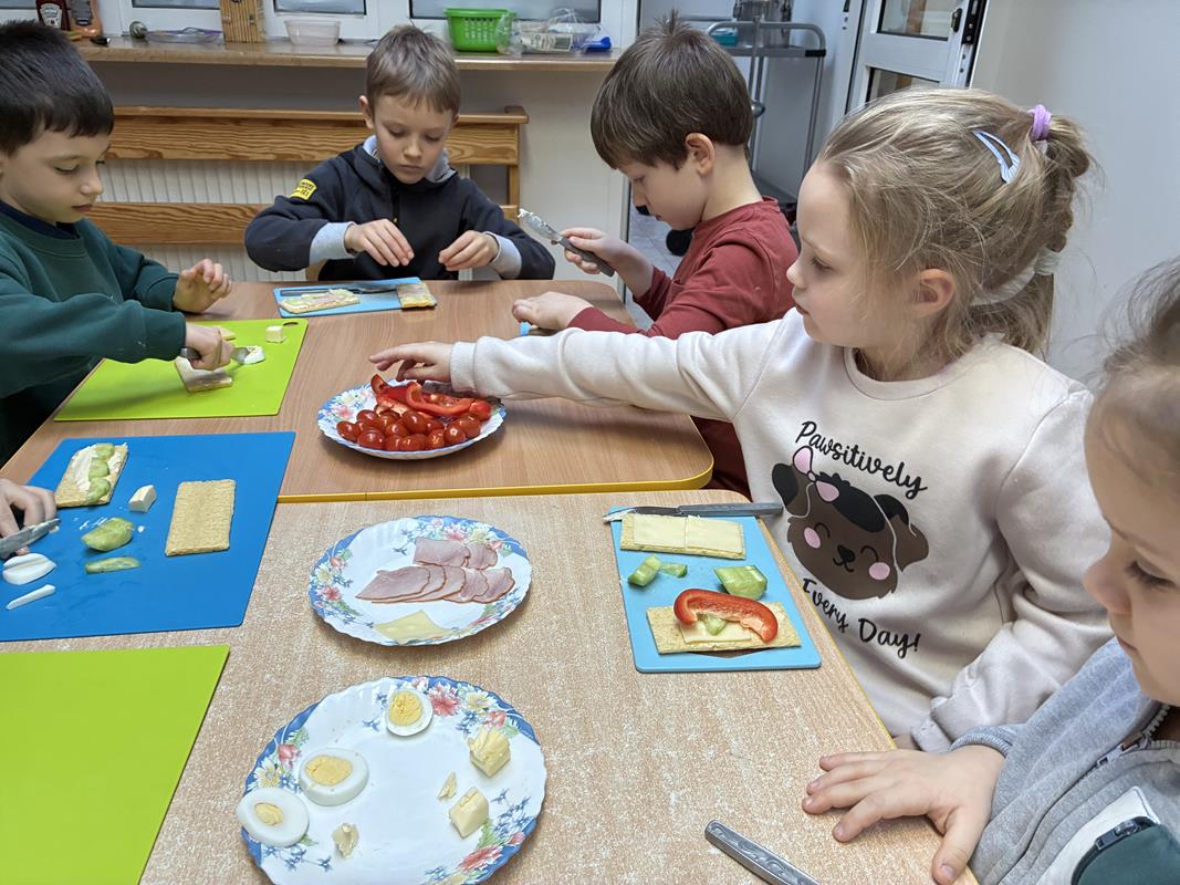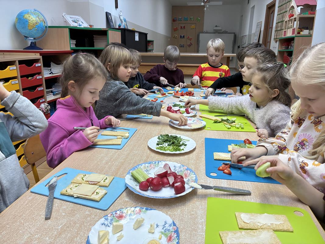 Czas ferii upłynął 5 i 6-latkom w kulinarnej atmosferze. Nie zabrakło tradycyjnych gofrów, które w tym czasie osładzają dzieciom zimowy czas. Chcieliśmy także szlifować naszą samodzielność przygotowując pyszne kanapki oraz warzywno-owocowy sok. Przedszkolaki wiedzą już, że kanapkę przyozdabiamy pomidorem, rzodkiewką, ogórkiem, a nawet natką pietruszki. Witamin zabraknąć nie może! Idąc tym tropem 6-latki pod okiem pani przygotowały sok przecierowy z owoców i warzyw. Grypa nam nie straszna! Do tego było pysznie!