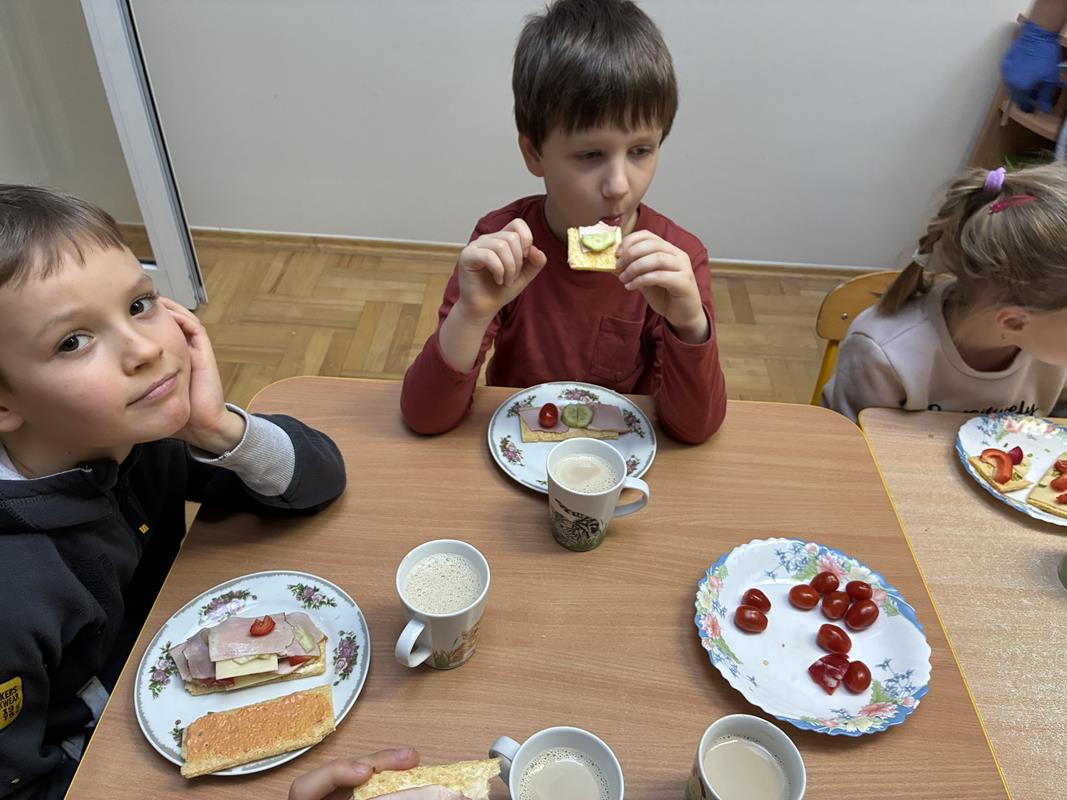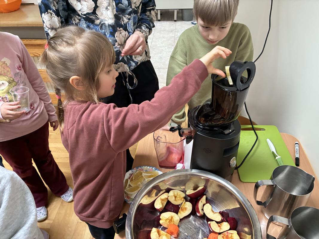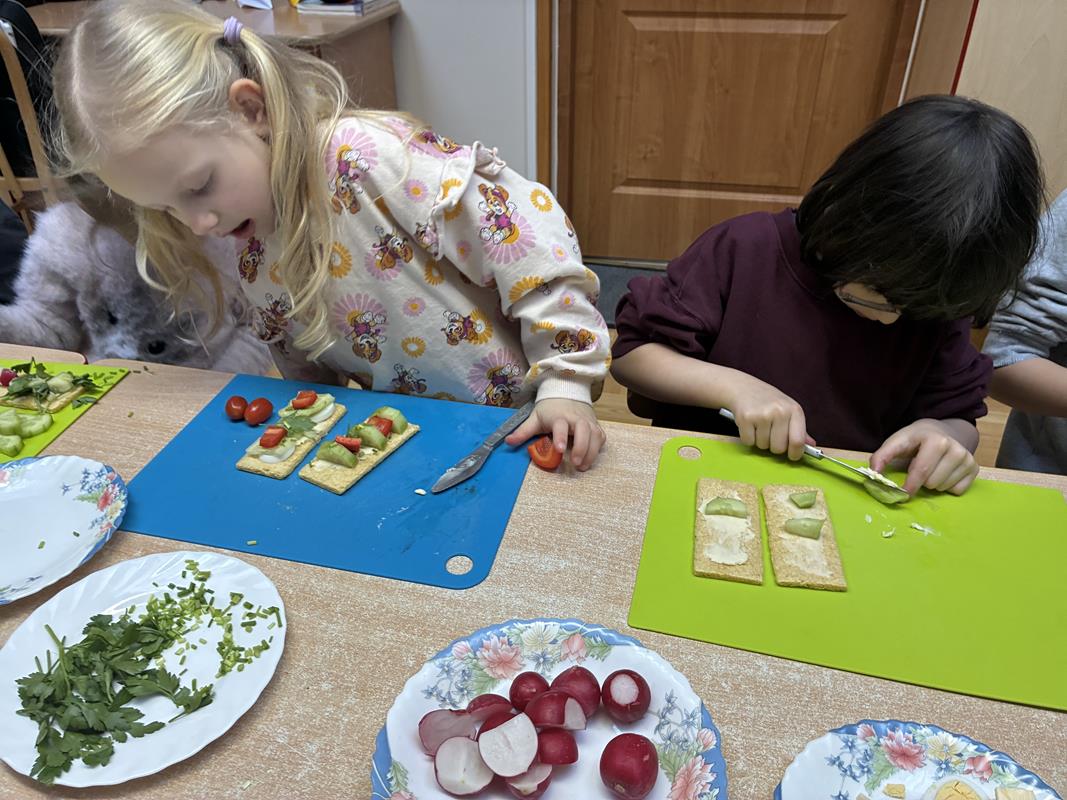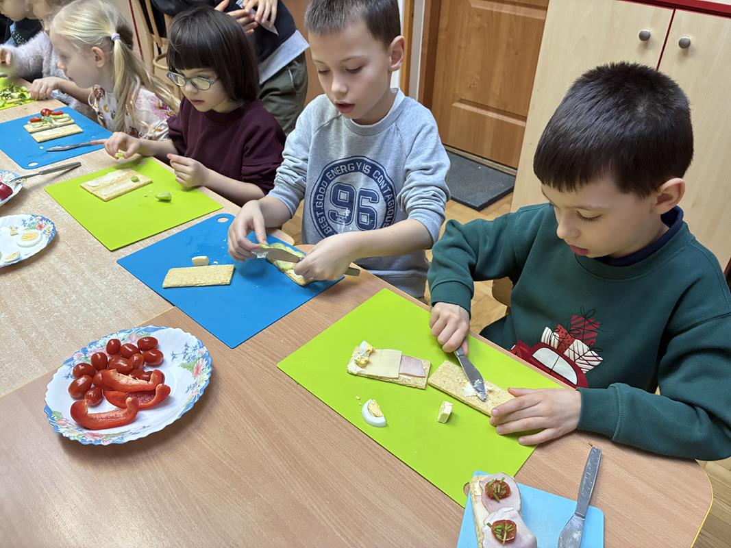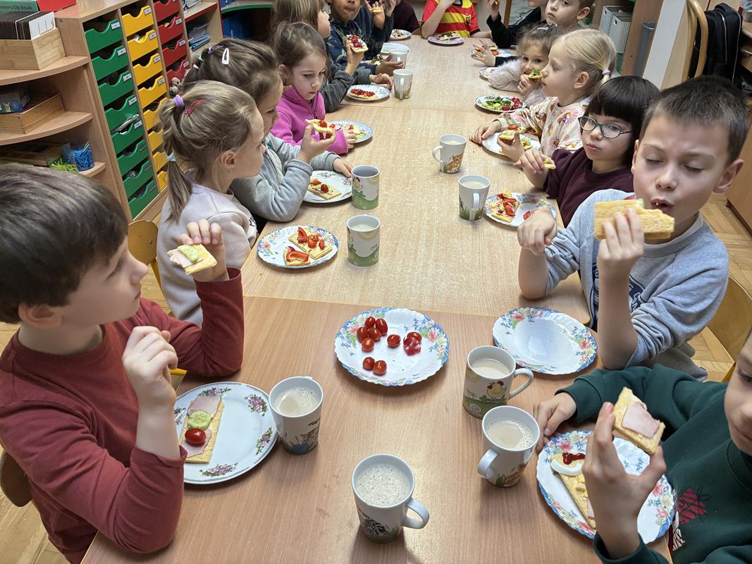 Czas ferii upłynął 5 i 6-latkom w kulinarnej atmosferze. Nie zabrakło tradycyjnych gofrów, które w tym czasie osładzają dzieciom zimowy czas. Chcieliśmy także szlifować naszą samodzielność przygotowując pyszne kanapki oraz warzywno-owocowy sok. Przedszkolaki wiedzą już, że kanapkę przyozdabiamy pomidorem, rzodkiewką, ogórkiem, a nawet natką pietruszki. Witamin zabraknąć nie może! Idąc tym tropem 6-latki pod okiem pani przygotowały sok przecierowy z owoców i warzyw. Grypa nam nie straszna! Do tego było pysznie!