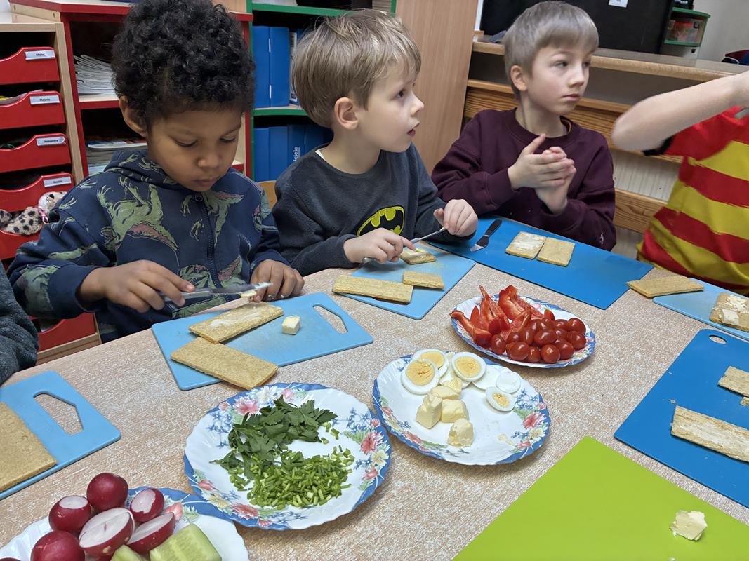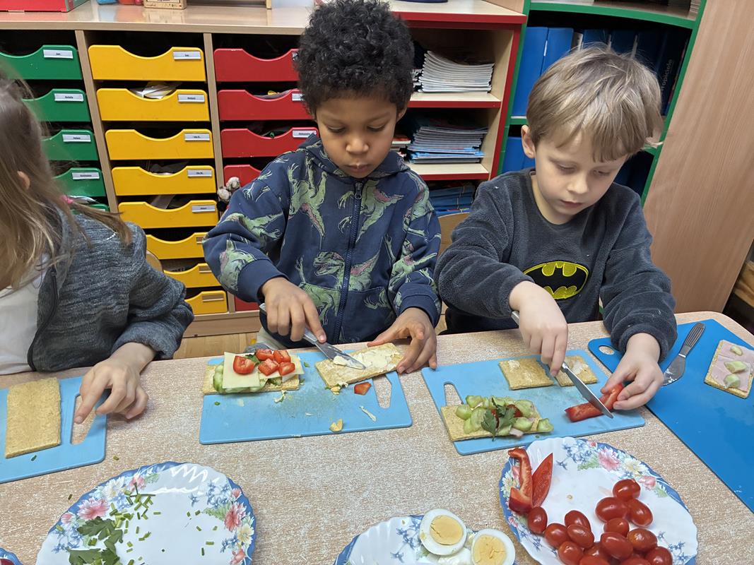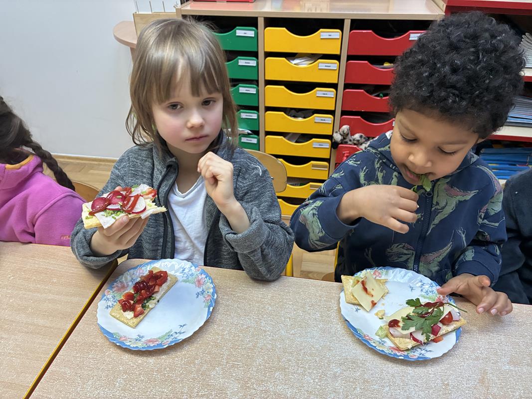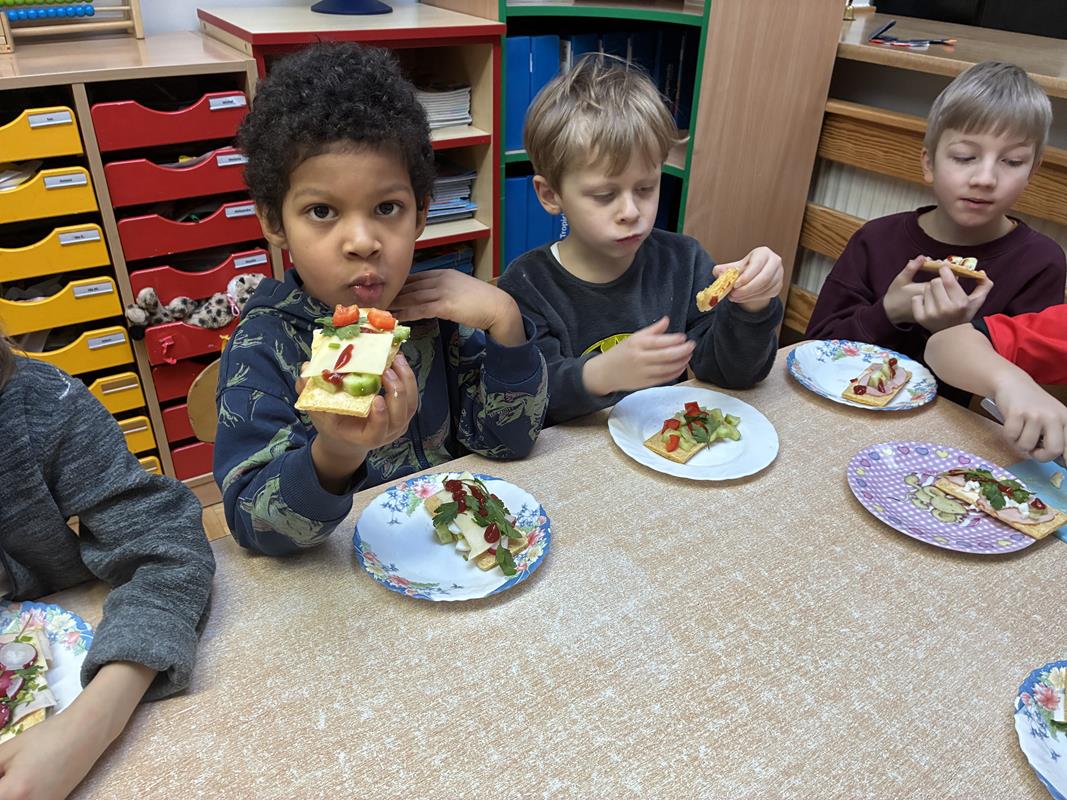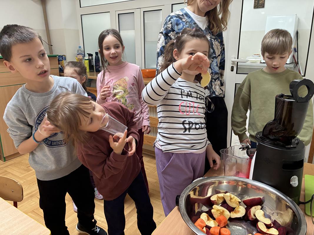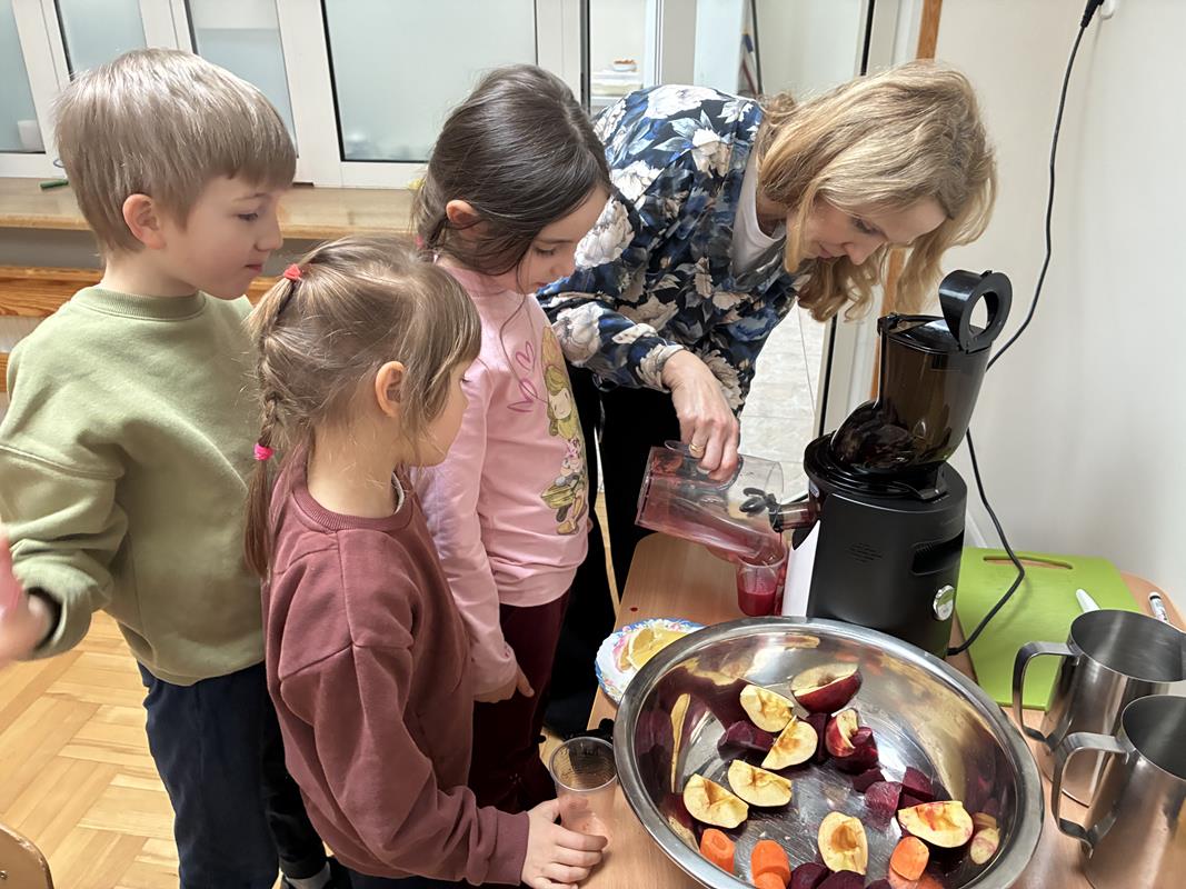 Czas ferii upłynął 5 i 6-latkom w kulinarnej atmosferze. Nie zabrakło tradycyjnych gofrów, które w tym czasie osładzają dzieciom zimowy czas. Chcieliśmy także szlifować naszą samodzielność przygotowując pyszne kanapki oraz warzywno-owocowy sok. Przedszkolaki wiedzą już, że kanapkę przyozdabiamy pomidorem, rzodkiewką, ogórkiem, a nawet natką pietruszki. Witamin zabraknąć nie może! Idąc tym tropem 6-latki pod okiem pani przygotowały sok przecierowy z owoców i warzyw. Grypa nam nie straszna! Do tego było pysznie!