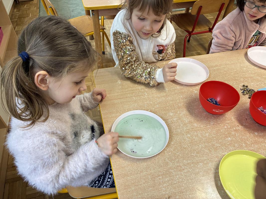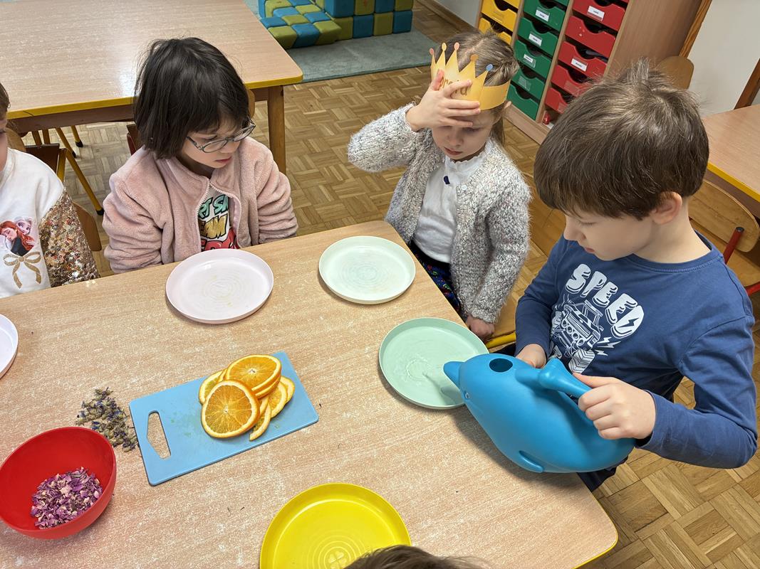 Po przygotowaniu potrzebnych produktów dzieci zabrały się za działanie. Plastry pomarańczy oraz suszone kwiaty znalazły miejsce na talerzykach wypełnionych zabarwioną wodą. Na twarzach rysowało się duże skupienie, ponieważ właśnie takie zabawy lubimy baaardzo. Było mieszanie, sypanie, i wąchanie…! Już od wejścia do sali unosił się aromat suszonej róży, soczystej pomarańczy i świeżo ściętych iglastych gałązek. Pozostało tylko wynieść piękne talerzyki na zewnątrz i cierpliwie czekać. Dzieła zawisły na krzewach na dziedzińcu i czekały na podziwianie przez dzieci i rodziców ?