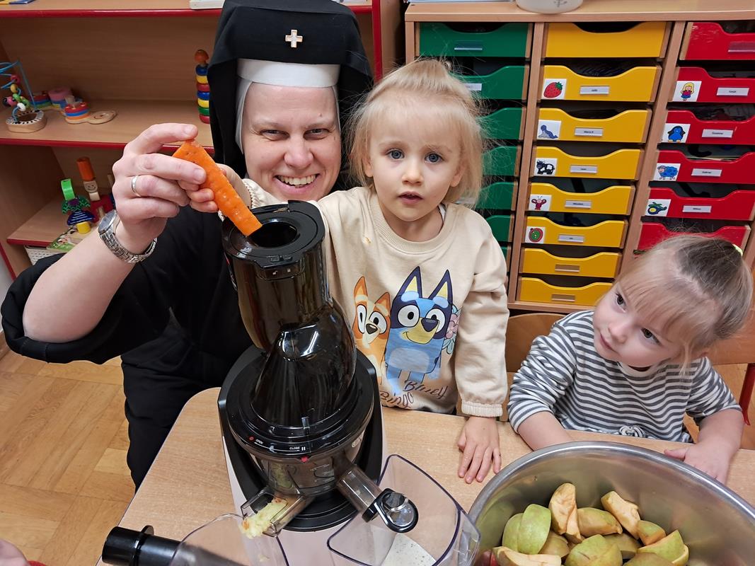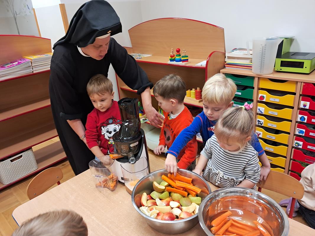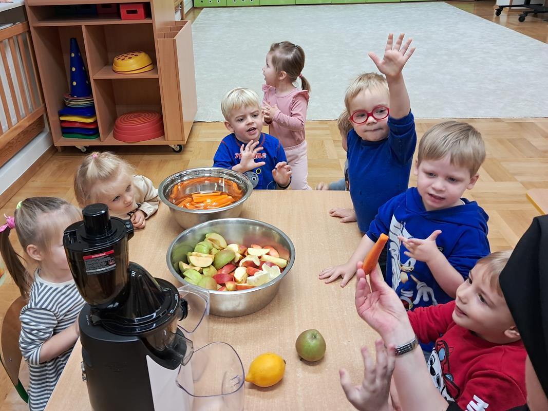 Dnia 15.10.2025 dzieci z grupy trzylatków wybrały się na spacer do pobliskiego warzywniaka. Celem wyjścia było poznanie różnych warzyw i owoców oraz utrwalenie zasad zdrowego odżywiania. Przedszkolaki miały okazję zobaczyć, jak wygląda praca w sklepie, dowiedziały się, skąd pochodzą sprzedawane warzywa i owoce, a także co można z nich przygotować. Dzieci rozpoznawały znane im produkty oraz nazywały ich kolory i kształty. Na zakończenie dzieci samodzielnie zakupiły potrzebne owoce i warzywa. Przedszkolaki miały możliwość zapoznania się z różnymi sposobami płacenia (bilon, karta, pieniądze papierowe). To była bardzo ciekawa i pouczająca wycieczka, która zachęciła dzieci do zdrowego jedzenia i zainteresowała ich światem przyrody! A po powrocie do przedszkola pracowite 3-latki zabrały się do kolejnej pracy – przygotowały zdrowy i pyszny sok owocowo-warzywny. Taka porcja zdrowia na pewno przyda się aby wzmocnić naszą odporność.
