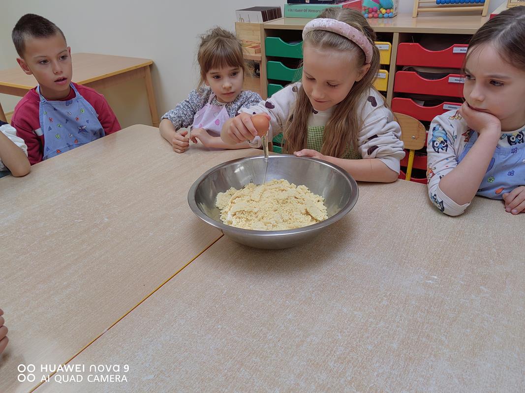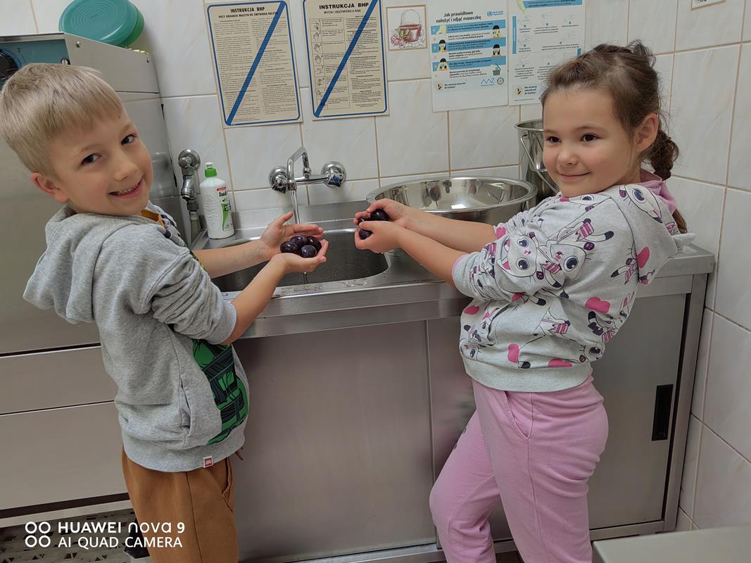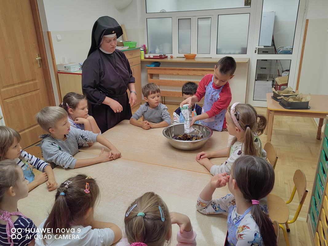 Śliwki są znane ze swoich właściwości korzystnych dla układu pokarmowego. Owoce te mają cenne witaminy z grupy C, B, E. Jak się okazuje – pieczenie ciasta to nie taka trudna sprawa. Szczególnie, gdy do pomocy jest tyle zdolnych rąk. Według przepisu, razem z siostrą Marceliną przygotowaliśmy odpowiednie produkty. Wszystkie dzieci były bardzo zaangażowane w przygotowywanie ciasta. Dzieci samodzielnie umyły śliwki i wyjęły pestkę.
