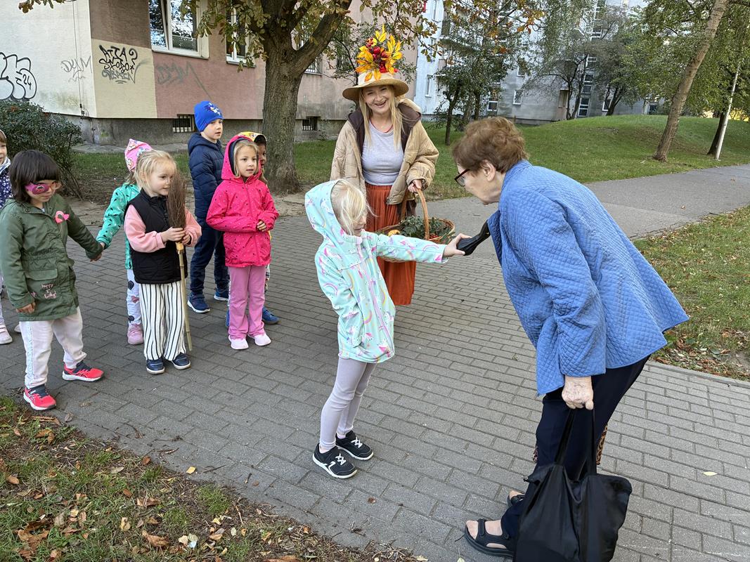 W drodze powrotnej dzieci miały do wykonania kolejne zadanie – przeprowadzenie krótkiego wywiadu z napotkanymi przechodniami. Po uprzednim przywitaniu się, zapytaniu o zgodę na rozmowę oraz ewentualne wykorzystanie wizerunku, dzieci zadawały pytanie: „Za co Panie lubią jesień?”. Odpowiedzi były podobne – powtarzały się zachwyty nad kolorami drzew oraz darami jesieni, które ta pora roku ze sobą przynosi. Było to dla naszej grupy świetne doświadczenie niosące za sobą wiele korzyści tj: inicjowanie rozmowy, trenowanie uprzejmości, pokonywanie nieśmiałości, poczucie dumy z wykonanego zadania, zyskiwanie doświadczenia, że większość ludzi jest przyjazna i chętna do rozmowy, ćwiczenie radzenia sobie w nowych sytuacjach. Natomiast ważnym elementem podczas tego zadania było utrwalanie zasad bezpieczeństwa podczas kontaktu z nieznajomymi, a ponieważ w tym tygodniu w grupie 5-latków tematem przewodnim były zagrożenia, więc był to dobry moment na rozmowy o właściwych reakcjach w kontaktach z nieznajomymi.