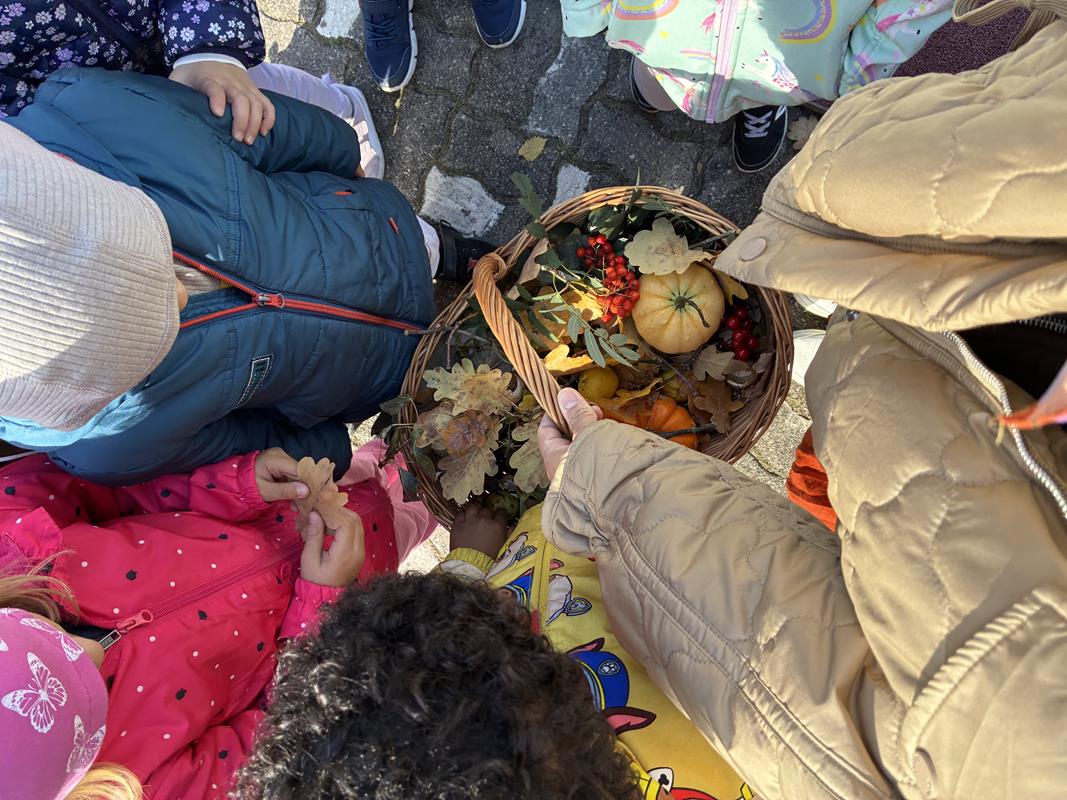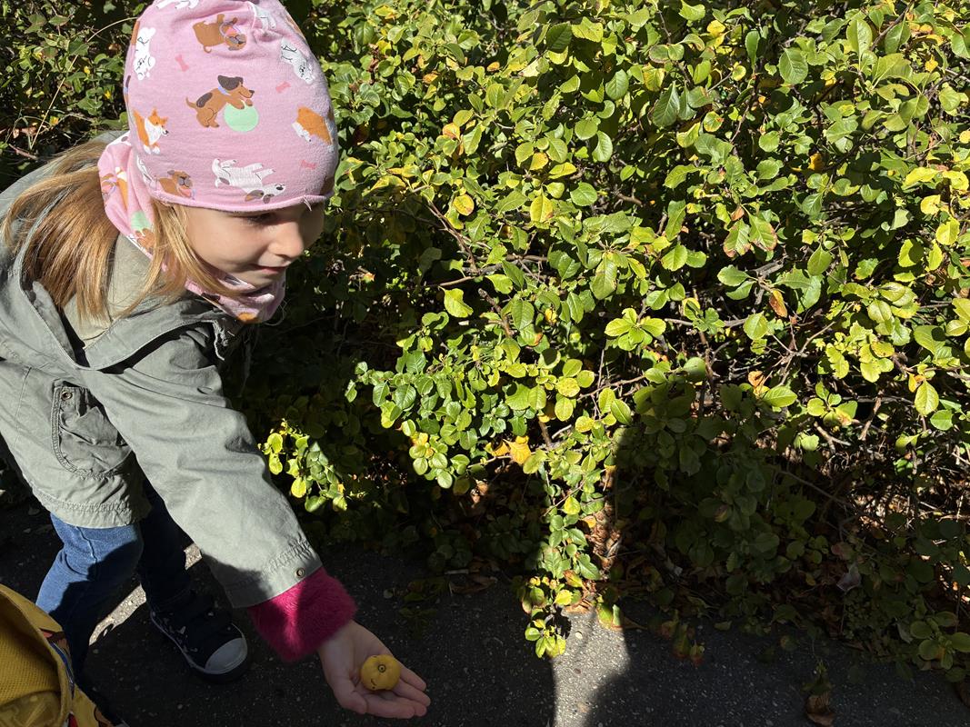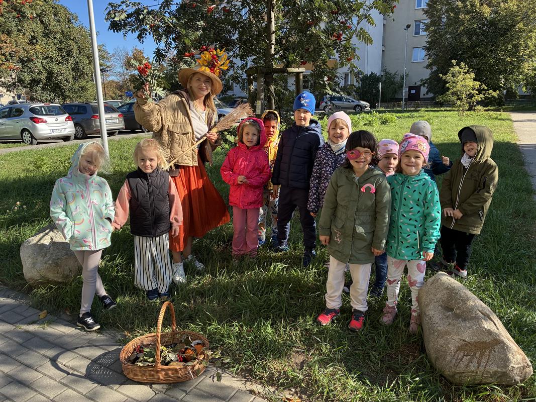 Oprócz zbierania darów jesieni do koszyka, największym wyzwaniem dla przedszkolaków było odnalezienie prawdziwej jarzębiny. Dzieci dobrze wiedzą, że tuż obok naszego przedszkola rośnie wiele drzew z czerwonymi kuleczkami – jednak nie są to jarzębiny, lecz jarzęby. Dzieci potrafią je rozróżnić, zwracając uwagę na kształt liści, co niezmiennie budzi podziw! 5-latki odnalazły również trudną do zauważenia pigwę. Zadanie zostało wykonane z sukcesem.