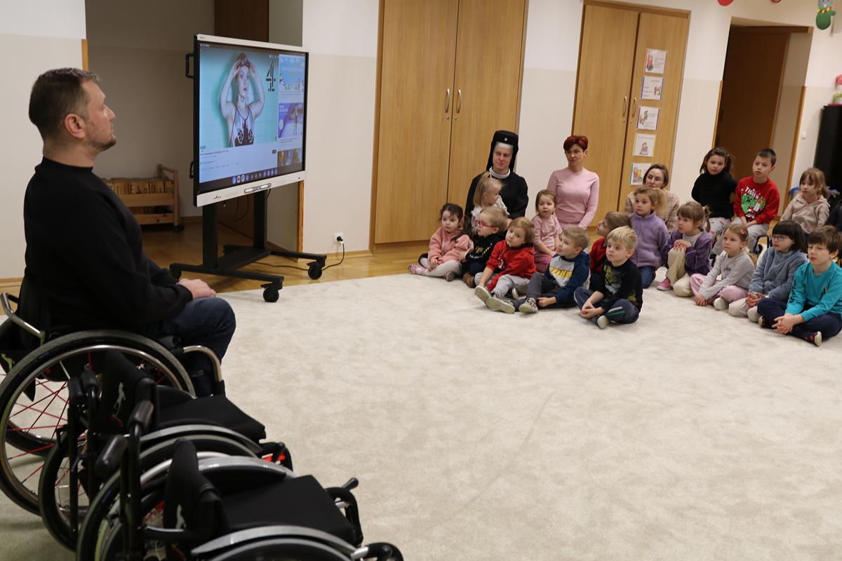 6 lutego przyjechał do nas Tato Poli, żeby opowiedzieć o niepełnosprawności. To było bardzo ciekawe spotkanie. Mówiliśmy o różnych rodzajach niepełnosprawności, o trudnościach osób niepełnosprawnych i o pracach jakie mogą podejmować – Tato Poli opowiedział o swojej pracy dla firmy, która produkuje wózki inwalidzkie. Rozmawialiśmy też o sporcie, dowiedzieliśmy się, że nasz gość grał kilka lat w reprezentacji Polski w koszykówkę i obejrzeliśmy krótki film z paraolimpiady. Było wiele pytań o sprawy zwyczajne: Jak Pan zakłada spodnie? A co jak winda się zepsuje? Czy Pan pływa? A na koniec dla wszystkich chętnych – próba samodzielnego pokierowania wózkiem. Serdecznie dziękujemy Tacie Poli za podzielenie się swoim doświadczeniem – mamy nadzieję, że dzięki temu spotkaniu lepiej zrozumiemy osoby niepełnosprawne wokół nas.