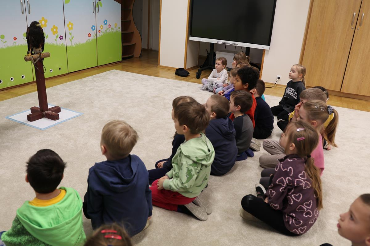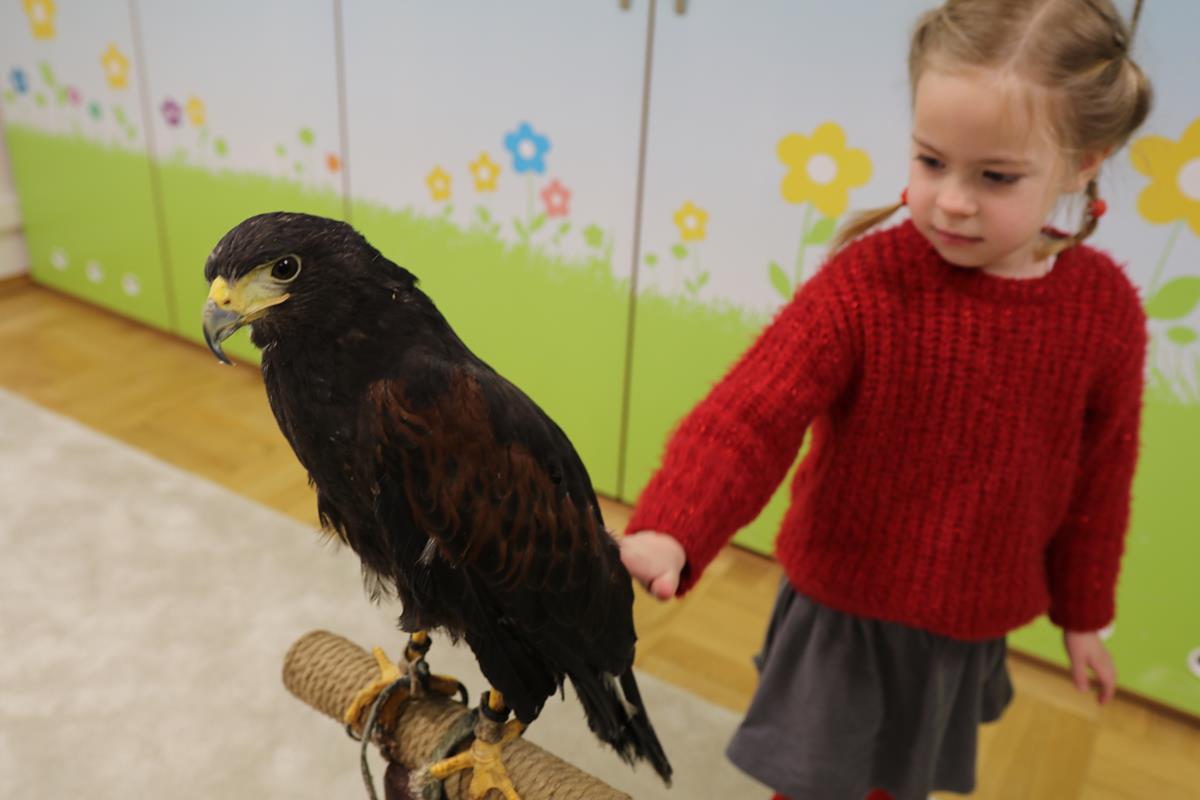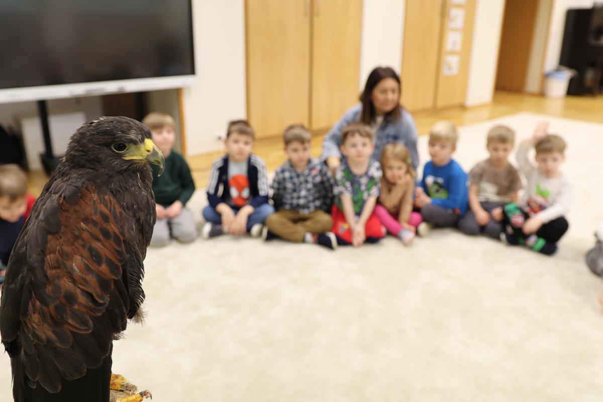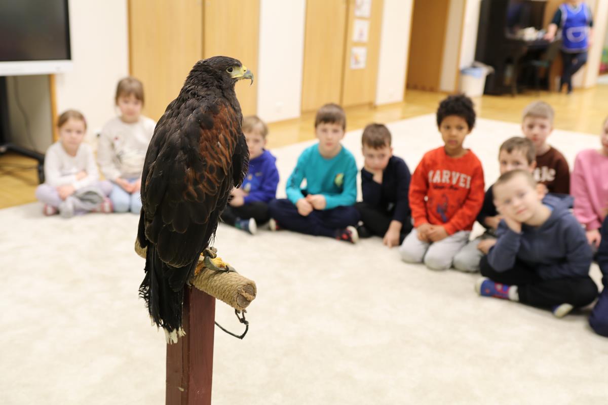25 lutego zawitał do nasz myszołów. A właściwie trzeba napisać, że zawitała, bo to była samiczka – Helenka. Dowiedzieliśmy się wielu ciekawostek na temat życia i zwyczajów ptaków drapieżnych w Polsce. Helenka była bardzo spokojna i trochę ciekawska – jej piękne czarne oczy w żółtych obwódkach cały czas bacznie nas obserwowały. Niezwykle emocjonujące było przebywanie w bliskości stworzenia, które zwykle widuje się tylko z daleka. Najodważniejsi zdecydowali się na pogłaskanie naszego gościa.