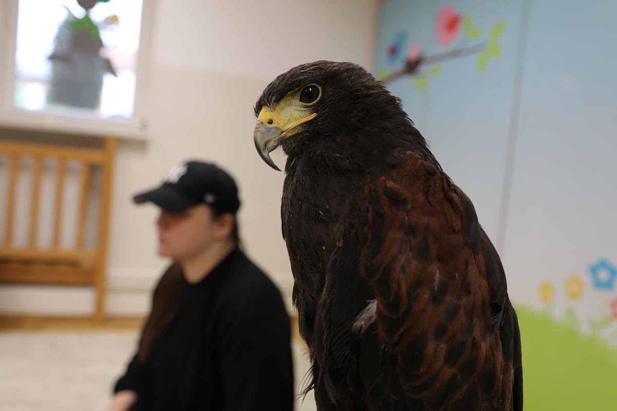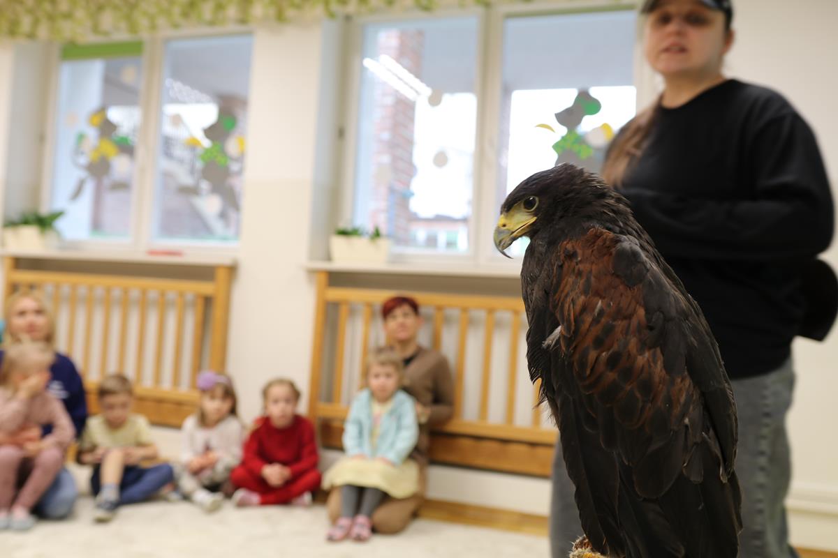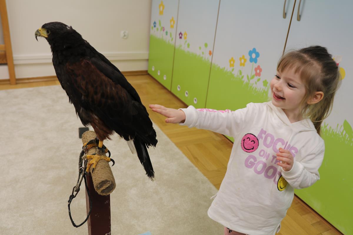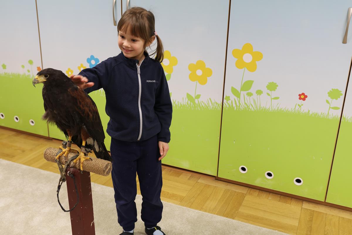 25 lutego zawitał do nasz myszołów. A właściwie trzeba napisać, że zawitała, bo to była samiczka – Helenka. Dowiedzieliśmy się wielu ciekawostek na temat życia i zwyczajów ptaków drapieżnych w Polsce. Helenka była bardzo spokojna i trochę ciekawska – jej piękne czarne oczy w żółtych obwódkach cały czas bacznie nas obserwowały. Niezwykle emocjonujące było przebywanie w bliskości stworzenia, które zwykle widuje się tylko z daleka. Najodważniejsi zdecydowali się na pogłaskanie naszego gościa.