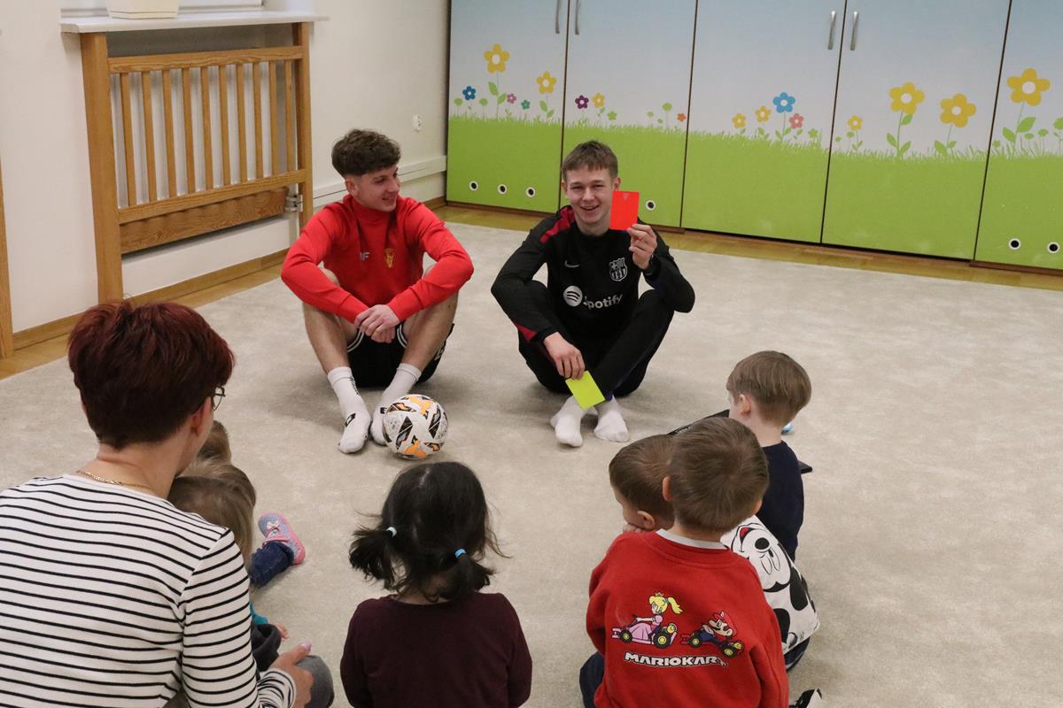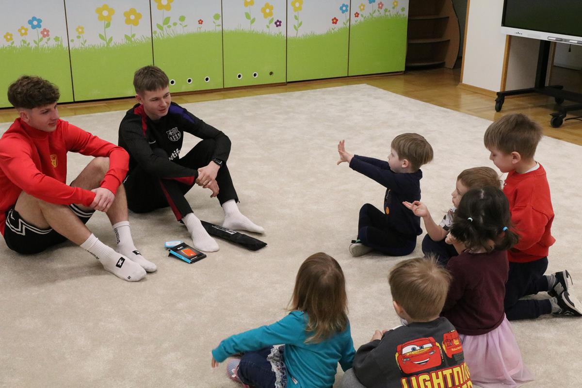 Dnia 12.03.2026 w grupie 3-latków odbyło się spotkanie z trenerami piłki nożnej. Podczas spotkania przedszkolaki mogły dowiedzieć się jakie korzyści płyną z aktywnie spędzonego czasu i uprawiania sportu. Trenerzy opowiedzieli o zasadach gry w piłkę nożną prezentując piłki, gwizdek, chorągiewkę i profesjonalny strój. Najwięcej radości sprawił jednak trening na przedszkolnym boisku, zarówno chłopcy jak i dziewczynki chętnie i z radością wzięli udział w zabawach ruchowych i meczu piłki nożnej. Dziękujemy Kacprowi i Alanowi za poświęcony czas i zaangażowanie!