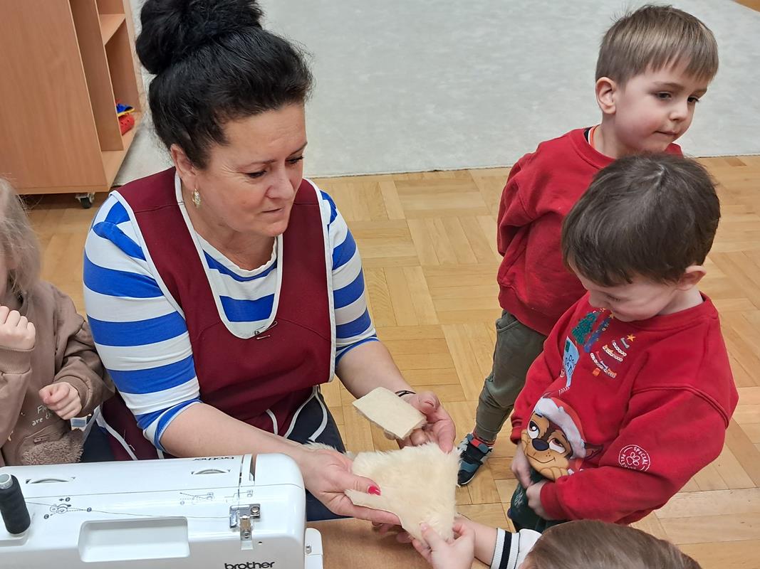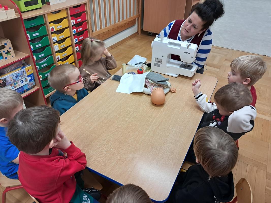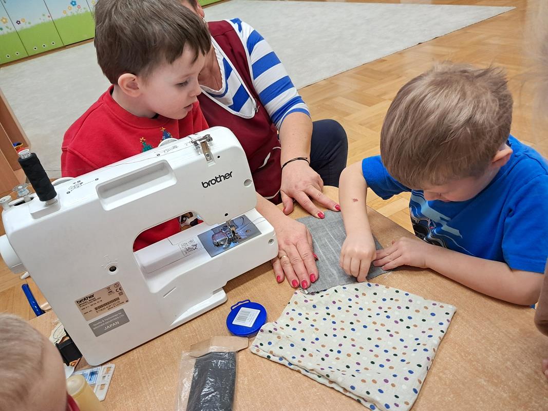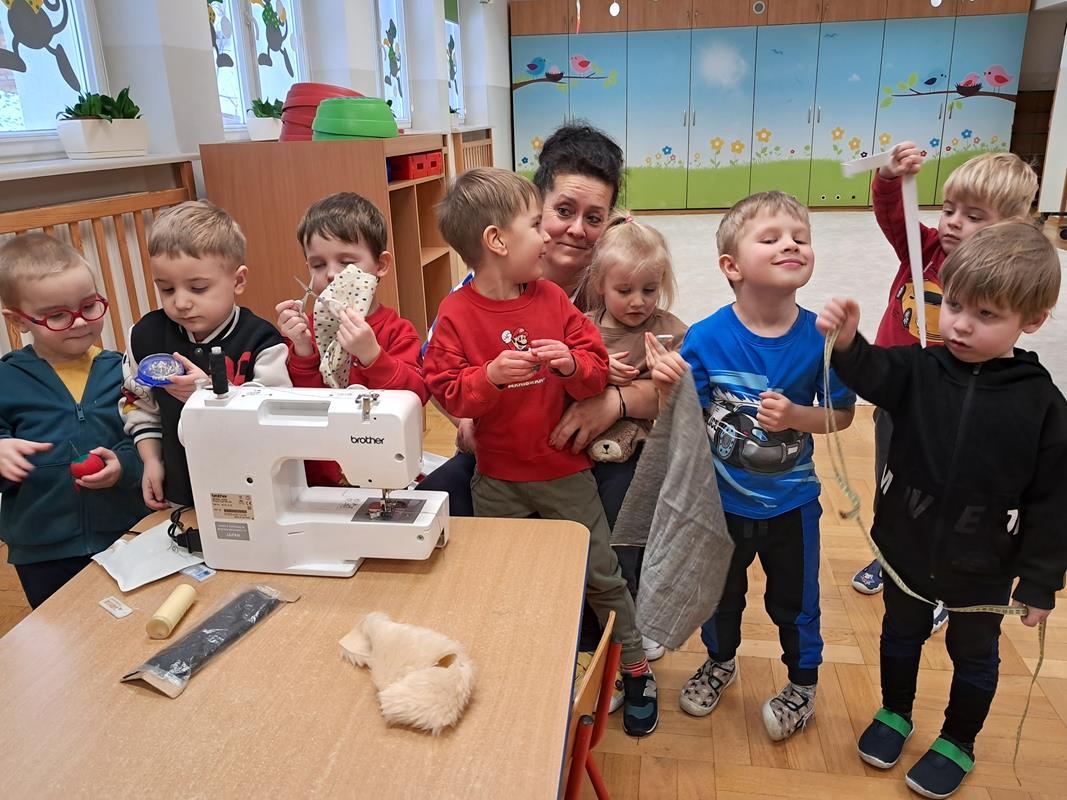 Dnia 19 lutego 2026 roku w grupie 3-latków w ramach tygodniowego tematu „Zawody” odbyło się spotkanie z krawcową. P. Iwonka – przedszkolna krawcowa – zaprezentowała i wyjaśniła przedszkolakom zastosowanie przyborów krawieckich: nożyce, igły, naparstek, magnes krawiecki, centymetr krawiecki, kredę krawiecką i różnorodne materiały i oczywiście maszynę do szycia. Następnie dzieci ustalały etapy powstawania odzieży a w kolejnej części spotkania próbowały własnych sił w robieniu miary, rysowaniu kroju i szyciu na maszynie. Dobrej zabawy materiałami, nićmi i szyciem nie było końca a i pożytek niemały – dzieci wspólnymi siłami uszyły worek na przedszkolne skarby!!! P. Iwonce serdecznie dziękujemy za przyjęcie 3-latkowego zaproszenia i „krawieckie opowieści” a małym krawcom za zaangażowanie i odwagę w poznawaniu nowych czynności i urządzeń. Sami zobaczcie co się działo w „ tańcu z nitką”…