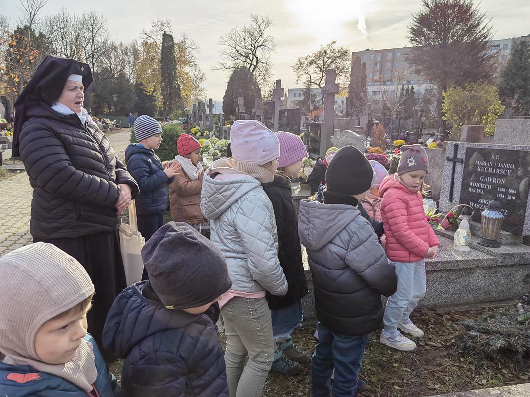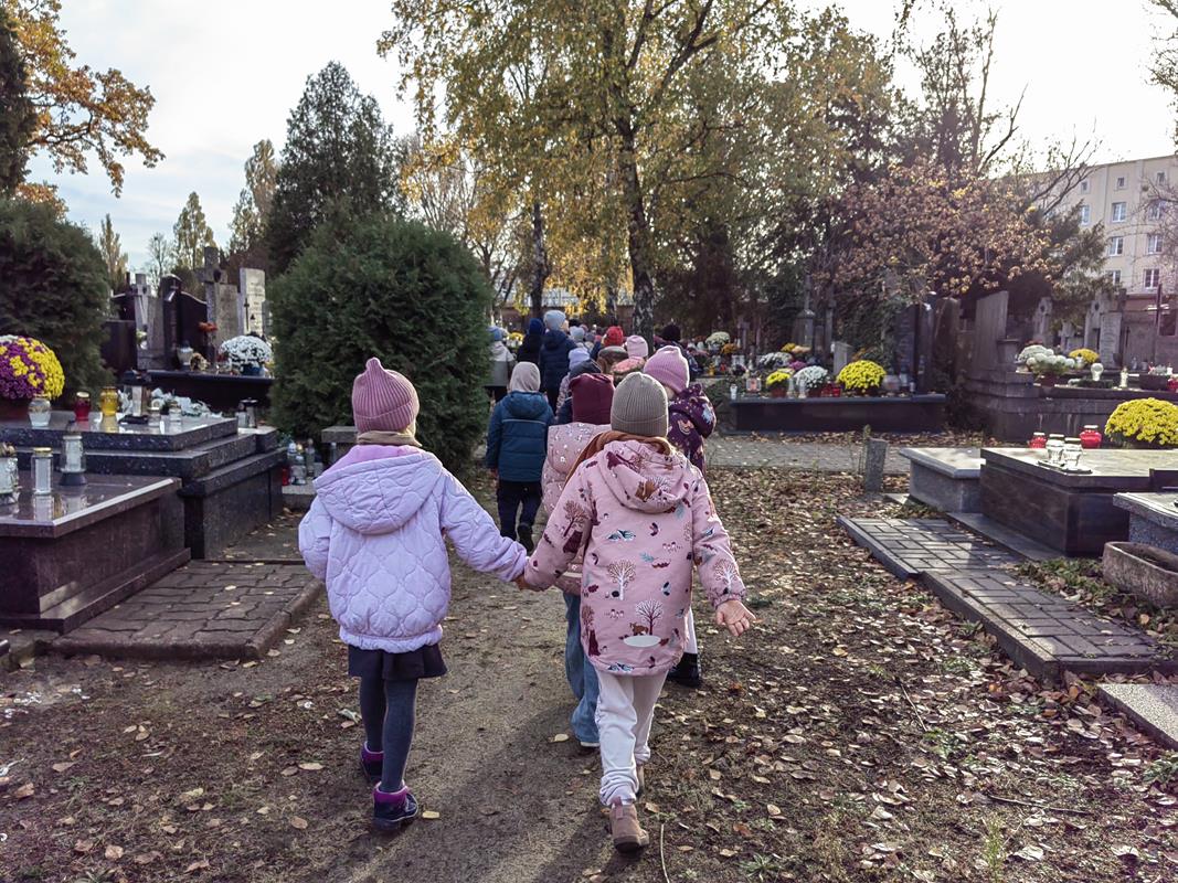 Podczas spaceru alejkami cmentarza dzieci mogły zobaczyć, jak ważne jest pamiętanie o tych, którzy odeszli. Zatrzymaliśmy się przy wybranych grobach, gdzie wspólnie modliliśmy się za dusze zmarłych, zapaliliśmy znicze i chwilą ciszy uczciliśmy ich pamięć.