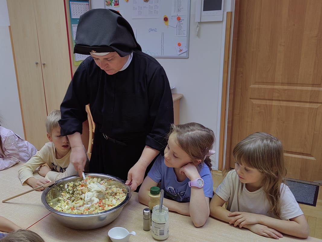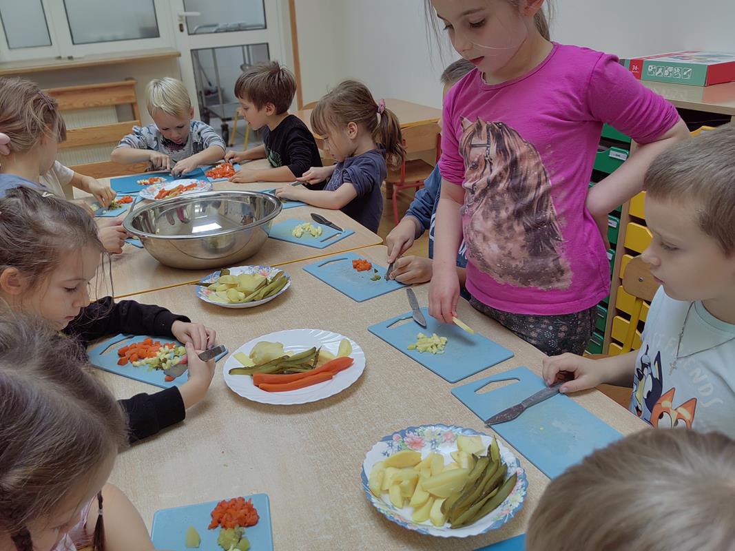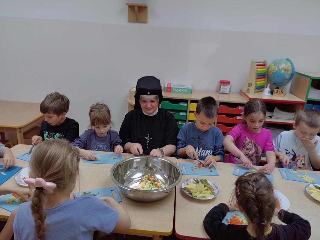 22 października w grupie 6-latków odbyły się wyjątkowe zajęcia kulinarne. Dzieci miały okazję samodzielnie przygotować pyszną sałatkę jarzynową. Pod okiem wychowawców poznały składniki, uczyły się ich krojenia i mieszania, a także dowiedziały się, jak ważne jest zdrowe odżywianie. Zabawa w kuchni sprawiła wszystkim wiele radości, a na zakończenie każde dziecko mogło spróbować swojej własnej sałatki. To był smakowity sposób na naukę współpracy, dbania o higienę i rozwijanie umiejętności manualnych.